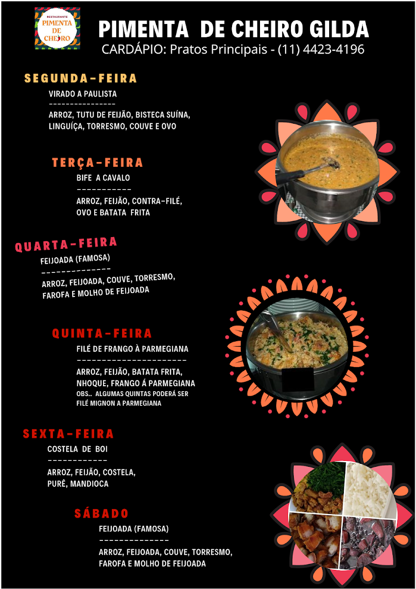 Welcome to Restaurante Pimenta de Cheiro Gilda, a gem nestled in the heart of Santo André, Brazil. This Brazilian restaurant brings the rich flavors of traditional cuisine to life, offering daily lunch specials that showcase the best of local ingredients and homestyle cooking. Each day, guests can enjoy dishes such as the hearty Virado a Paulista on Mondays and the beloved feijoada on Wednesdays. The menu caters to all tastes while maintaining a commitment to affordable pricing, making it a top choice for locals.